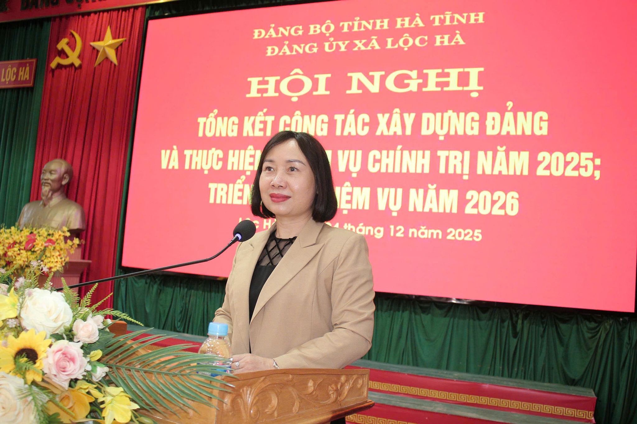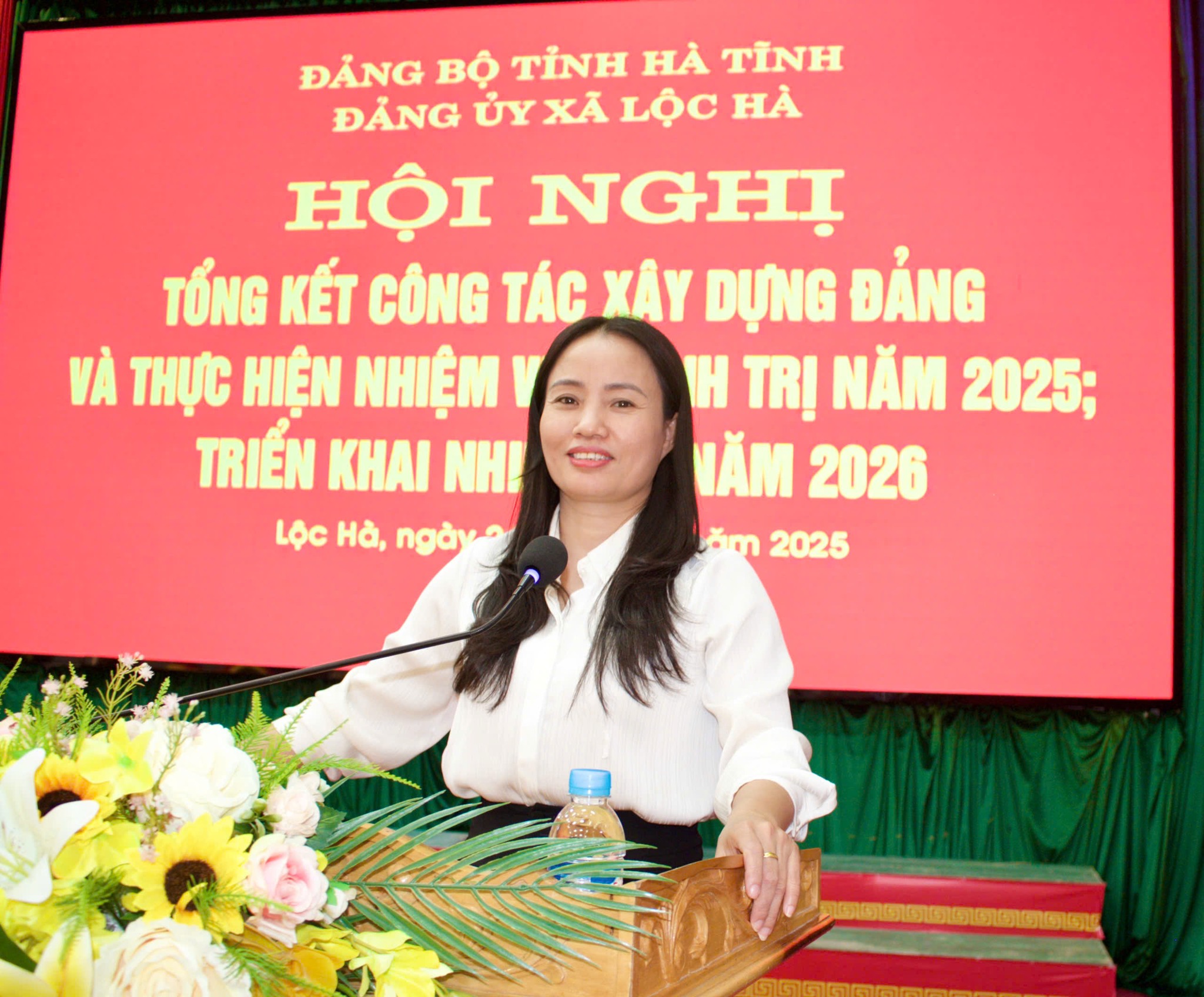 Đồng chí Nguyễn Thị Hiền - Phó Bí thư Thường trực Đảng ủy thông qua báo cáo tại hội nghị, báo cáo nêu rõ: Năm 2025 là năm đầu tiên triển khai mô hình chính quyền địa phương 2 cấp, Đảng bộ xã Lộc Hà thực hiện nhiệm vụ trong bối cảnh có cả thuận lợi lẫn khó khăn. Thực hiện Nghị quyết 1686/NQ-UBTVQH15 ngày 16/6/2025 về sắp xếp đơn vị hành chính, xã Lộc Hà được thành lập trên cơ sở sáp nhập bốn xã: Thị trấn Lộc Hà, Bình An, Thạch Kim và Thịnh Lộc. Trong năm qua, Đảng bộ xã Lộc Hà đã tập trung lãnh đạo, chỉ đạo triển khai đồng bộ các nhiệm vụ trên các lĩnh vực; chú trọng công tác xây dựng Đảng về chính trị, tư tưởng, đạo đức; nâng cao chất lượng sinh hoạt chi bộ; tăng cường công tác kiểm tra, giám sát; phát huy vai trò nêu gương của cán bộ, đảng viên. Nhờ đó, tình hình Kinh tế - Xã hội trên địa bàn xã tiếp tục ổn định, Quốc phòng - An ninh được giữ vững, đời sống Nhân dân từng bước được nâng lên.
